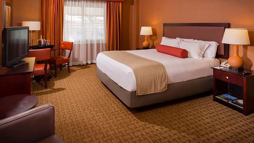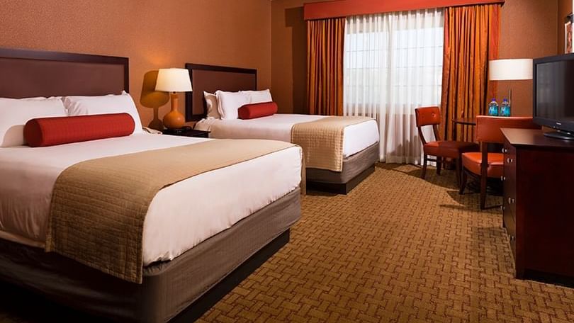 Relax in our Deluxe King or Queen rooms. This 387 square-foot room comes with one king or two queen beds, a leather chair and marble-topped vanity.