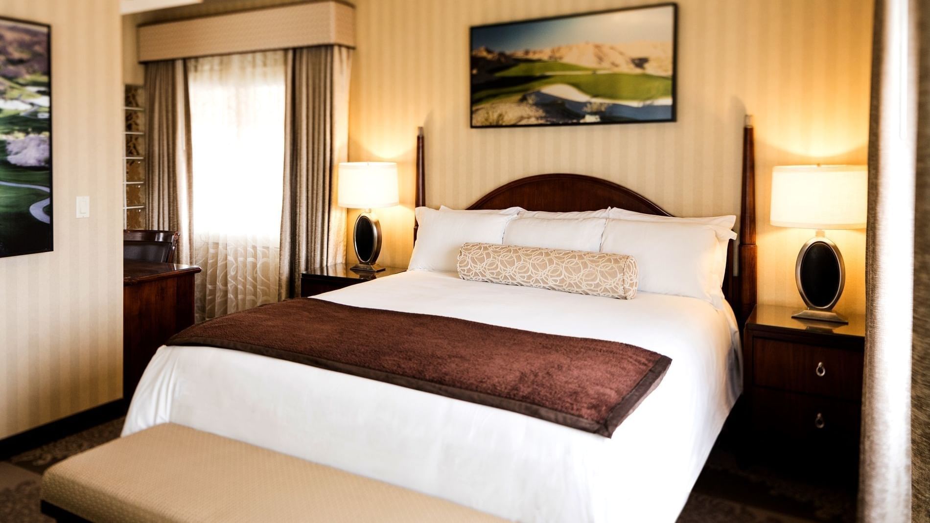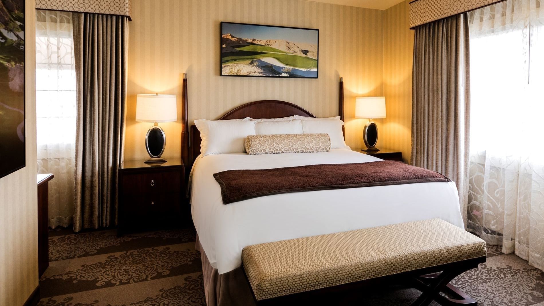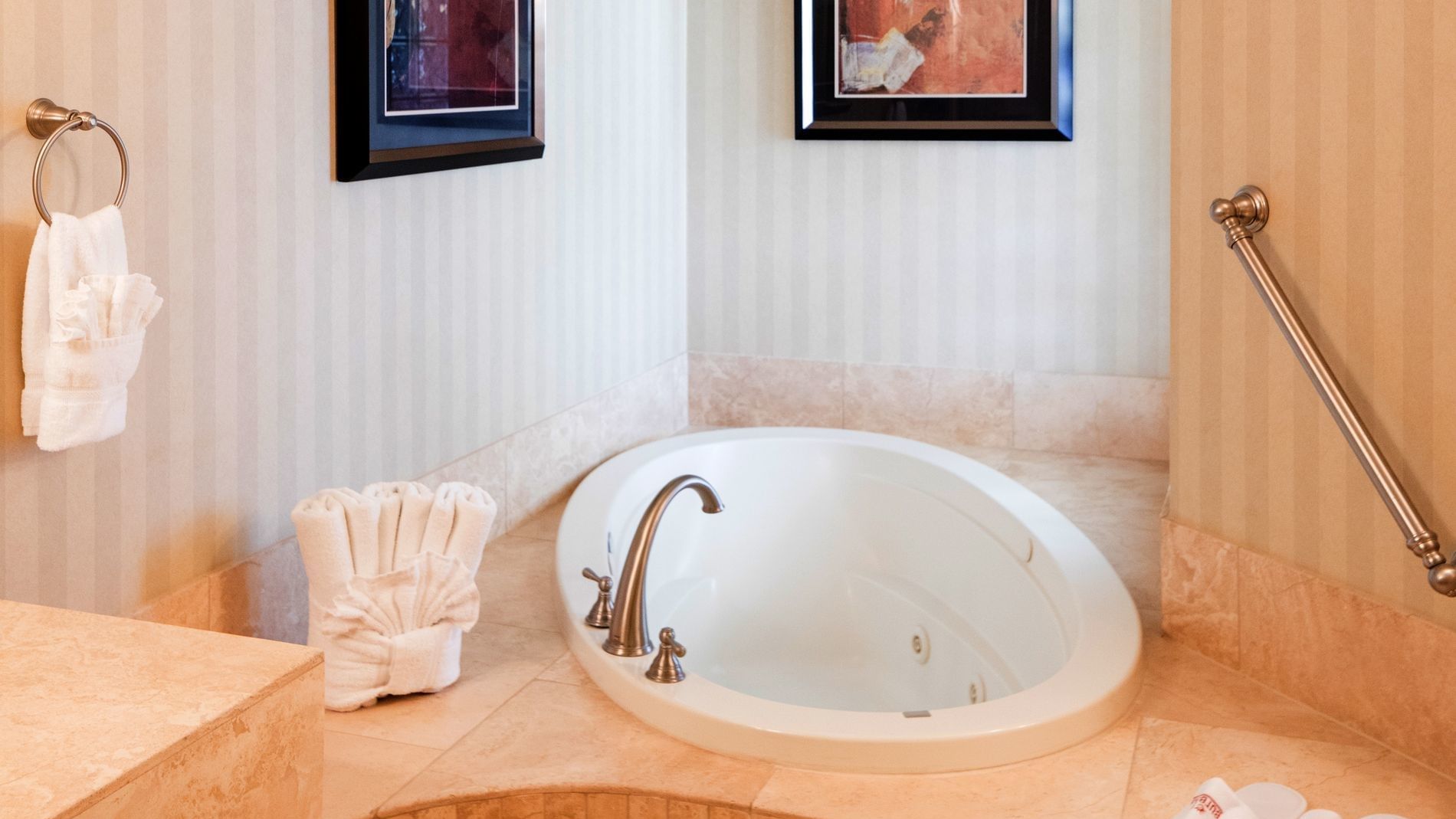 This 885 square-foot suite features a marble-topped wet bar and work area with desk. The centerpiece of the master bedroom is a large, comfortable bed draped in 400 thread-count linens. A marble bathroom with a jetted tub and step-in shower completes this luxurious package.